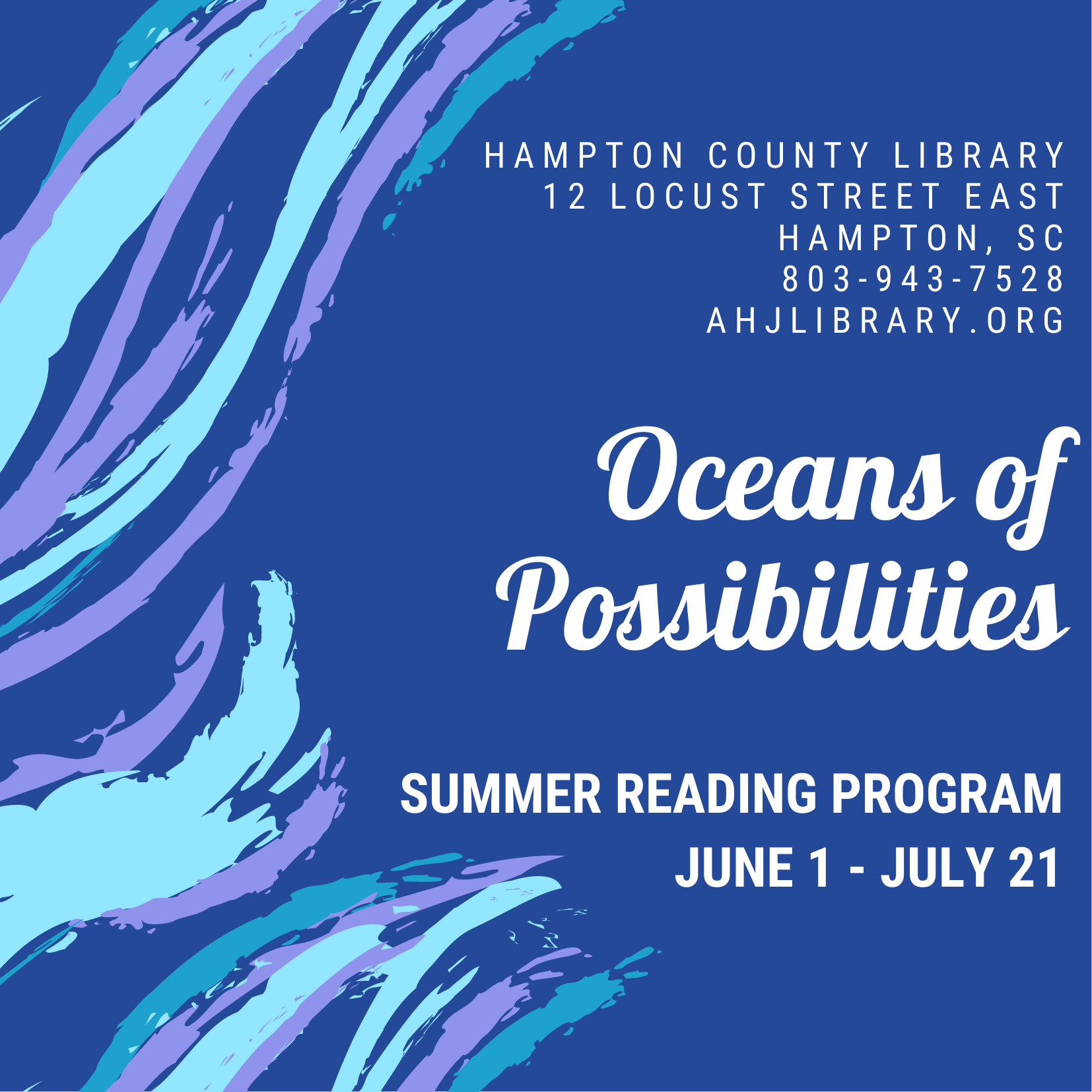 5. Join a summer reading program. Our very own Hampton County Library located at 12 Locust Street East, Hampton is offering “Oceans of Possibilities” Summer Reading Program. Registration begins June 1. Children turn in reading logs July 11-15. They will be entered to win cool prizes. There are weekly programs they can attend as well that include storytellers, tower gardening, crafts, puppet shows, and ocean science!